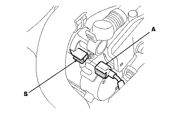 11. Make sure the shift lever is in N or P, then disconnect the connector (A) from the starter S terminal. Connect a jumper wire from the battery positive terminal to the S terminal.