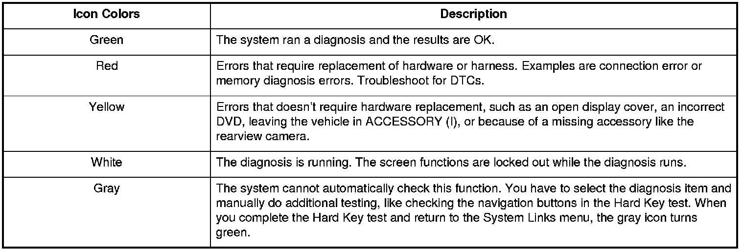 When the diagnosis finishes, the icons turn different colors based on their test status. The color definitions are shown below and can also be seen by selecting Help on the System Links screen.