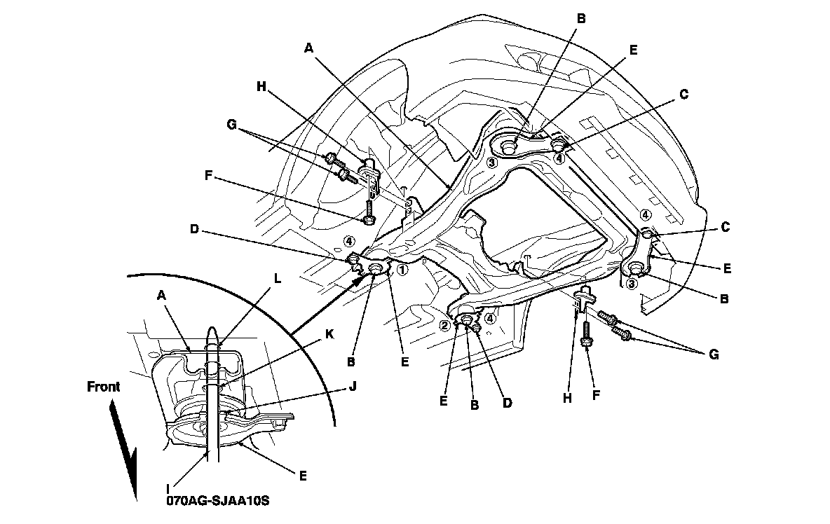 -3 Insert the subframe alignment pin (I) through the positioning slot (J) on the right rear stiffener, through the positioning hole (K) on the subframe, and into the positioning hole (L) on the body, then loosely tighten the subframe right rear mounting bolt.