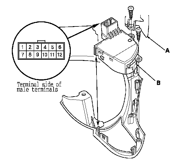 3. Remove the select/reset/information switch (A), then remove the cruise control combination switch (B).