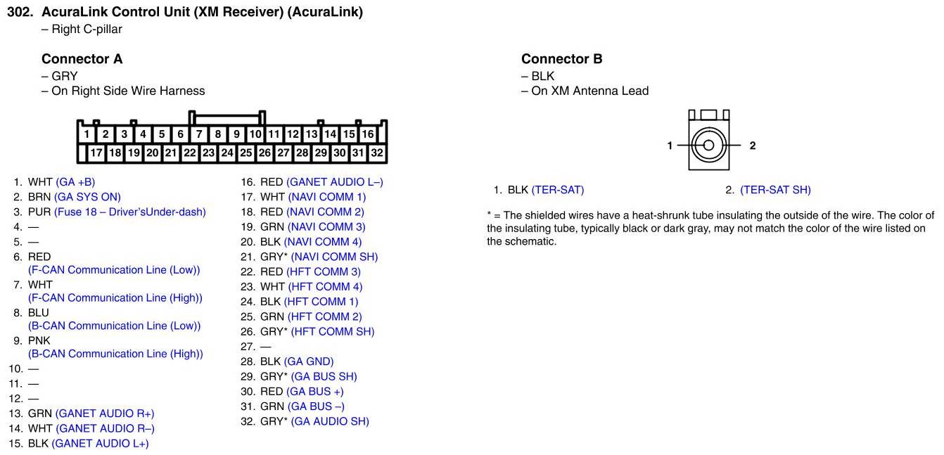 View 302 - AcuraLink Control Unit (XM Receiver) Connector View (AcuraLink)