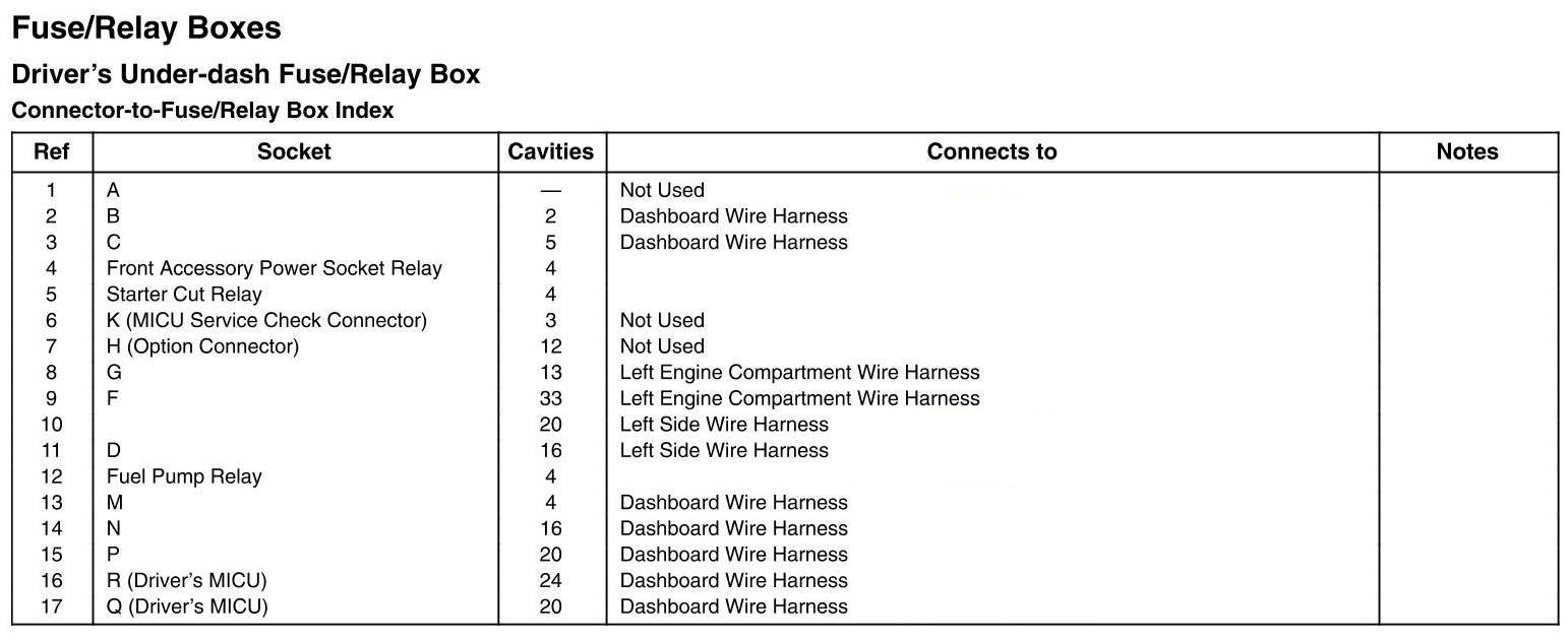 Driver's Under-dash Fuse/Relay Box - Connector-to-Fuse/Relay Box Index