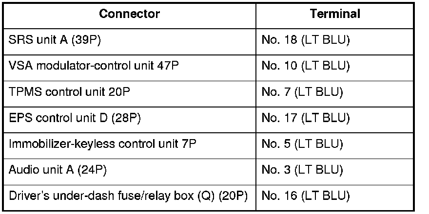 NO - Repair short in the wire between the DLC (K-line) and the VSA modulator-control unit, the SRS unit, the TPMS control unit, the EPS control unit, the immobilizer-keyless control unit, the audio unit, or the driver's under-dash fuse/relay box.