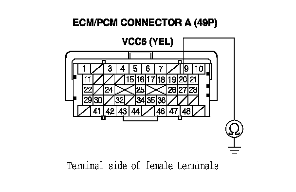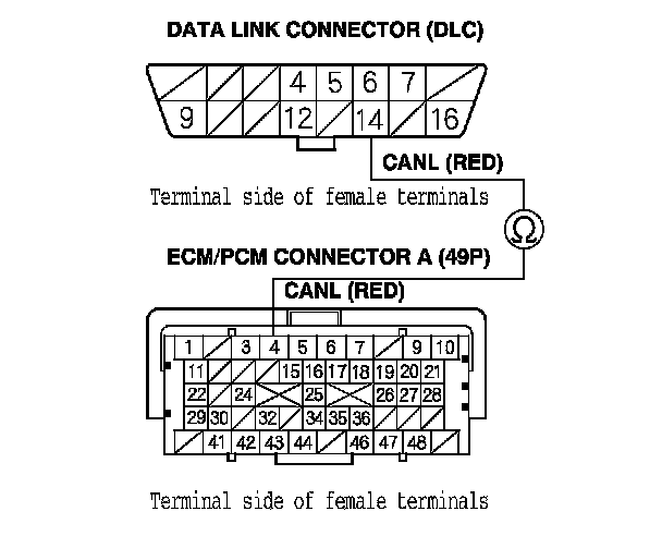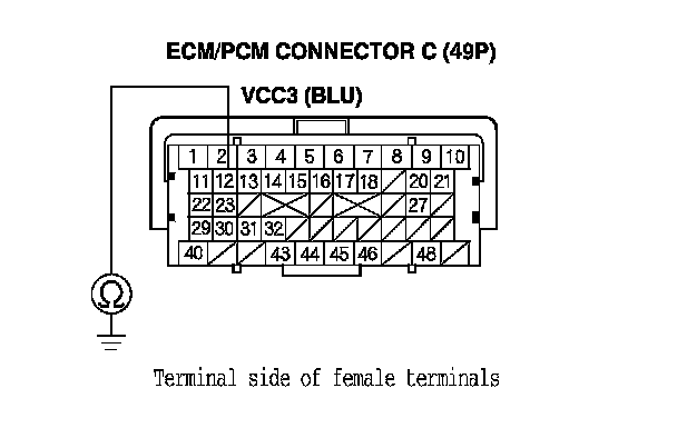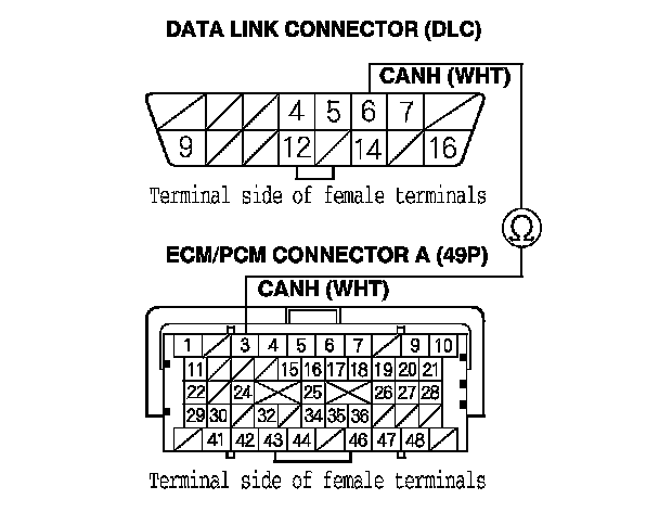 32. Check for continuity between ECM/PCM connector terminal A3 and DLC terminal No. 6.