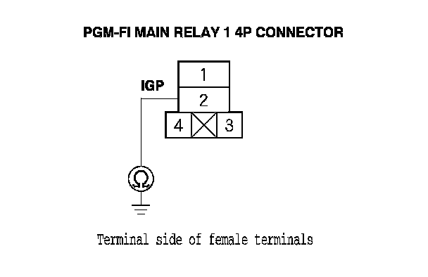 43. Check for continuity between PGM-FI main relay 1 4P connector terminal No. 2 and body ground.
