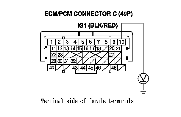 59. Measure the voltage between ECM/PCM connector terminal C10 and body ground.