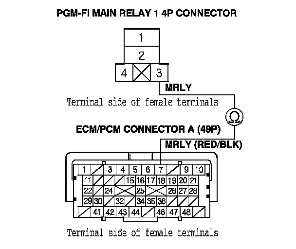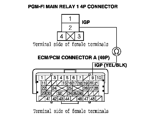 48. Check for continuity between PGM-FI main relay 2 4P connector terminal No. 2 and body ground.