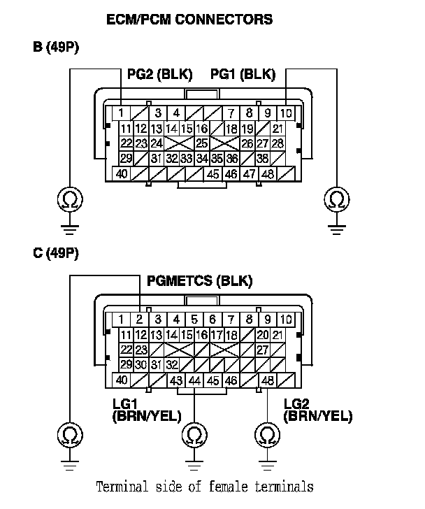 71. Check for continuity between body ground and ECM/PCM connector terminals B1, B10, C2, C44, and C48 individually.