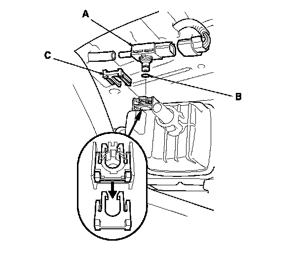 4. Install the parts in the reverse order of removal with a new O-ring (B) and a new retainer (C).