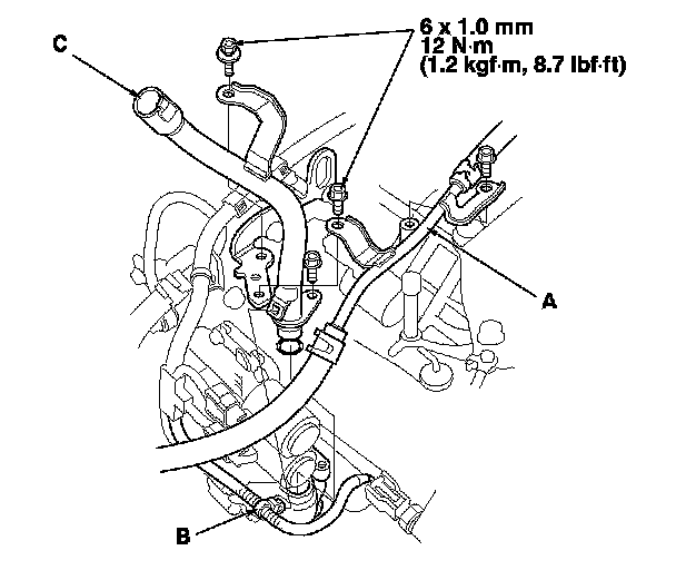 10. Remove the ATF dipstick, and remove the bolts securing the ATF cooler line (A). Remove the harness clamp (B), then remove the ATF dipstick guide tube (C).