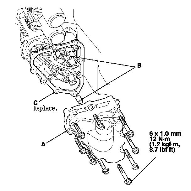 11. Remove the shift solenoid valve cover (A), the dowel pins (B), and the gasket (C).