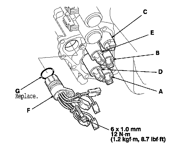 14. Disconnect the shift solenoid valve connectors from the shift solenoid valves. Then replace the ATF temperature sensor/shift solenoid wire harness assembly (F), and the O-ring (G) with new ones.