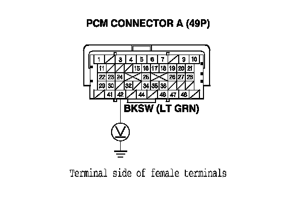 21. Measure the voltage between PCM connector terminal A42 and body ground while pressing the brake pedal and when the brake pedal is released.