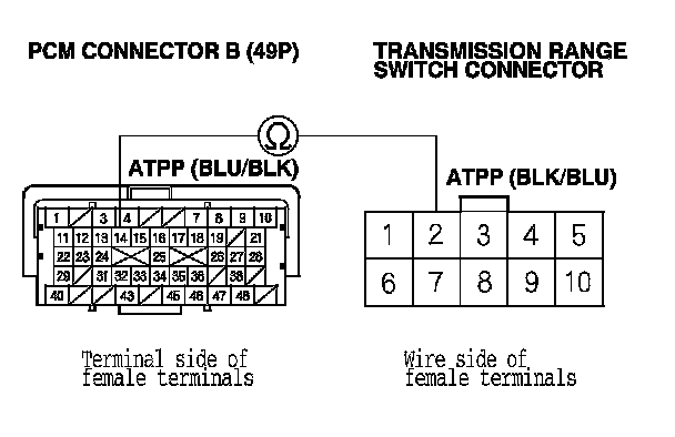 32. Check for continuity between PCM connector terminal B14 and transmission range switch connector terminal No. 2.