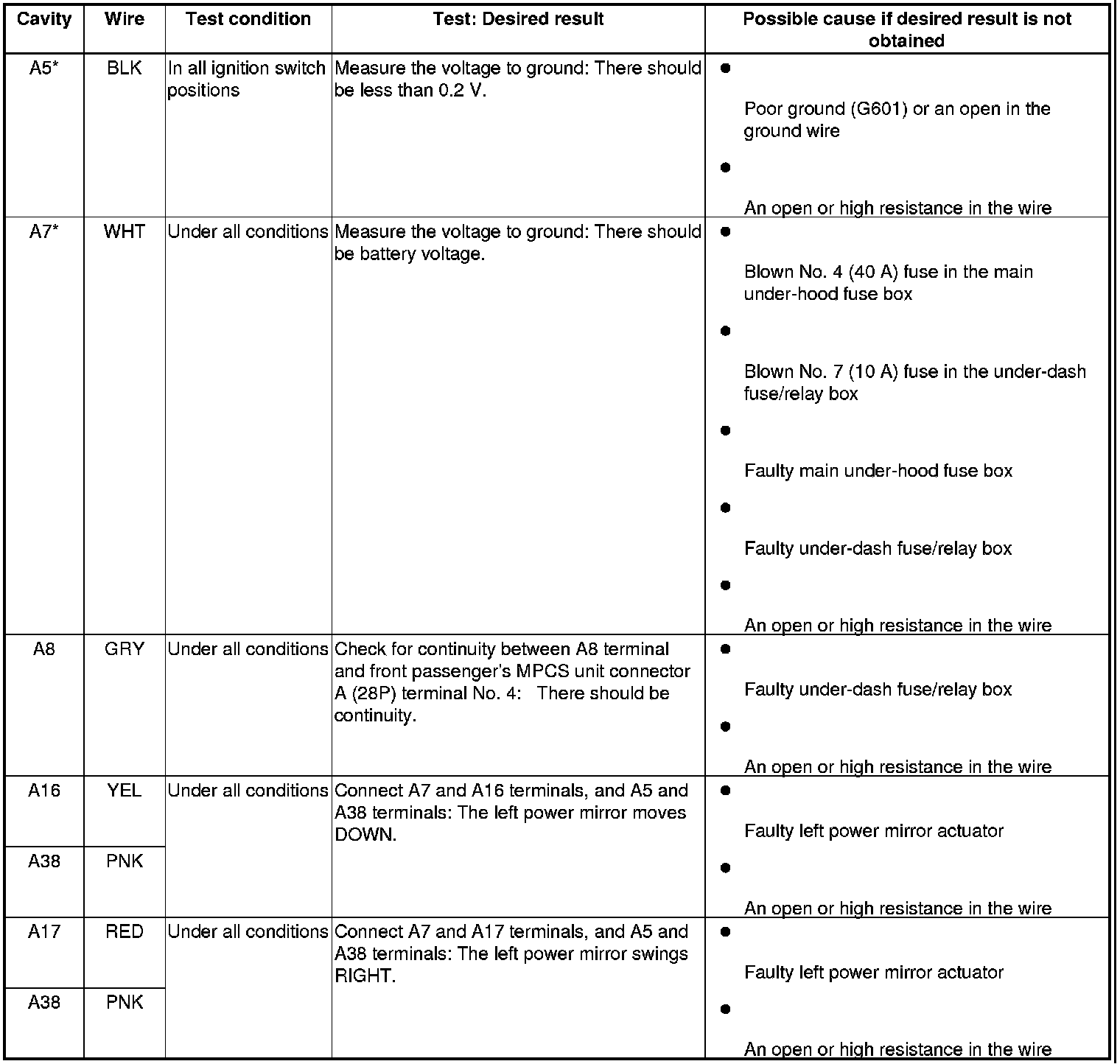 5. Reconnect the connector to the under-dash fuse/relay box, and do the following input tests: