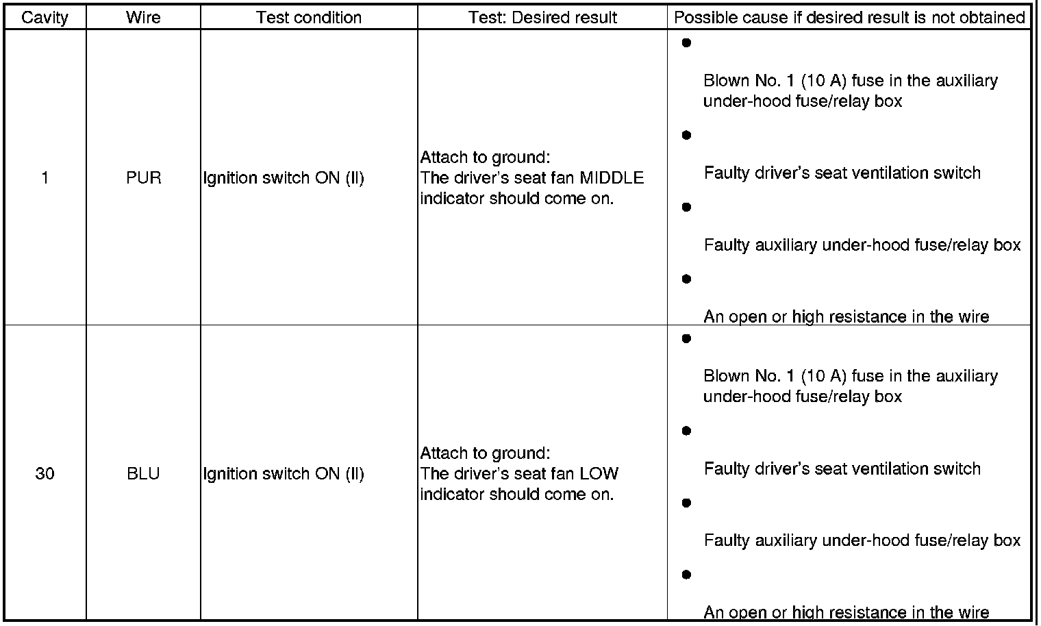NOTE: Before testing, check the No. 2 (OP1) (40 A) fuse in the main under-hood fuse box, the No. 30 (10 A) fuse in the under-dash fuse/relay box, and the No. 4 (20 A) fuse in the under-dash fuse/relay box.