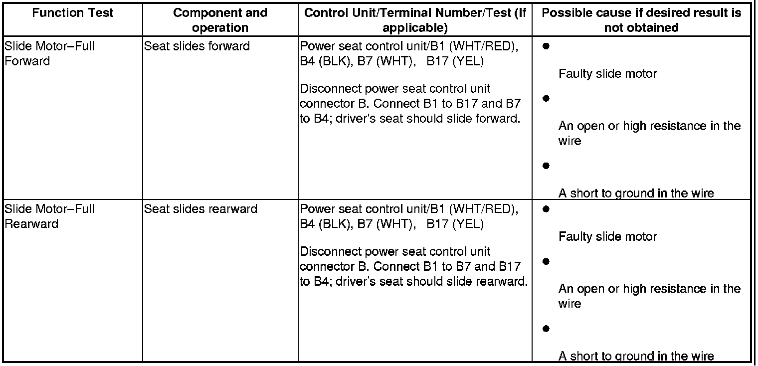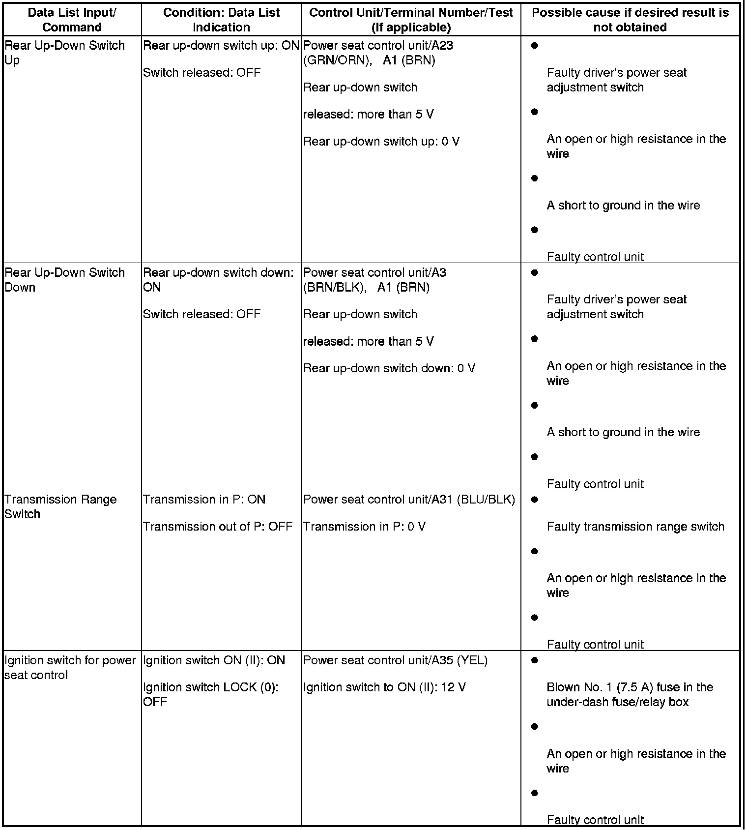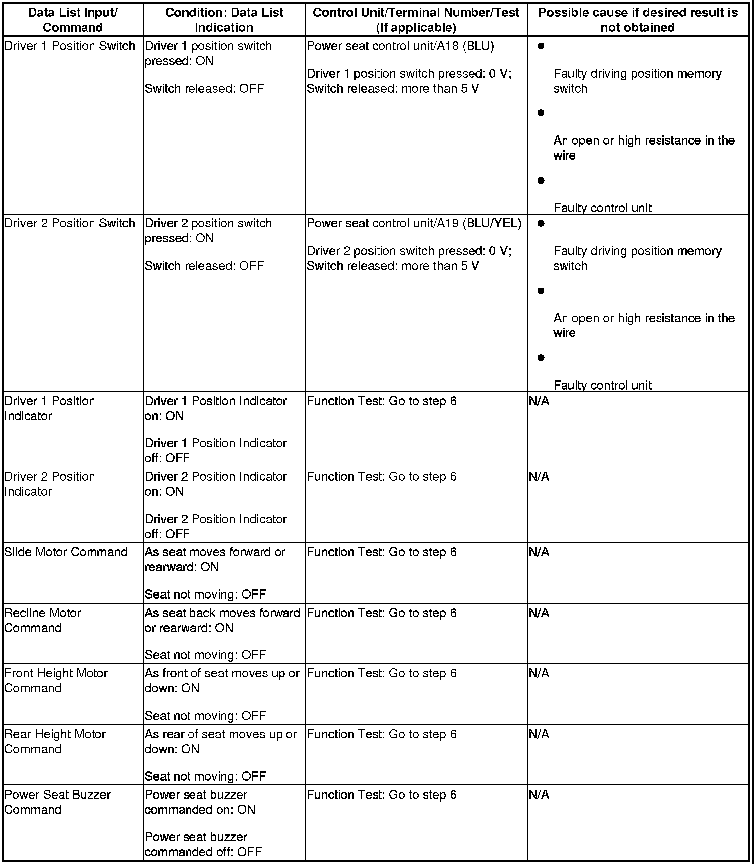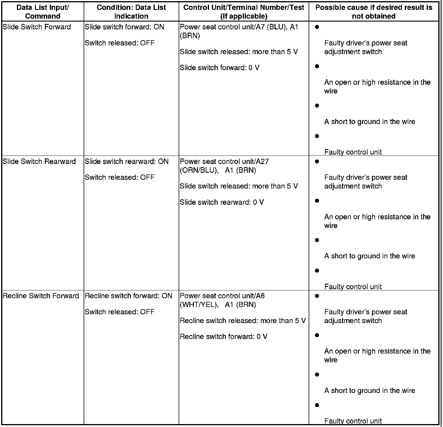 - If the function does not operate normally, perform the appropriate test at the control unit and terminal indicated in the table.