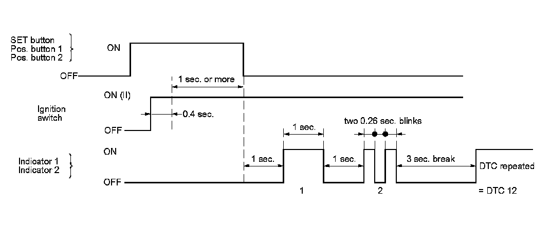 If a system problem occurs and a DTC is stored, the indicators will show the DTC. The first digit is indicated by the number of long (1 second) blinks, and the second digit is indicated by the number of short (0.26 second) blinks. There is a 3 second break between each DTC when there are multiple DTCs.