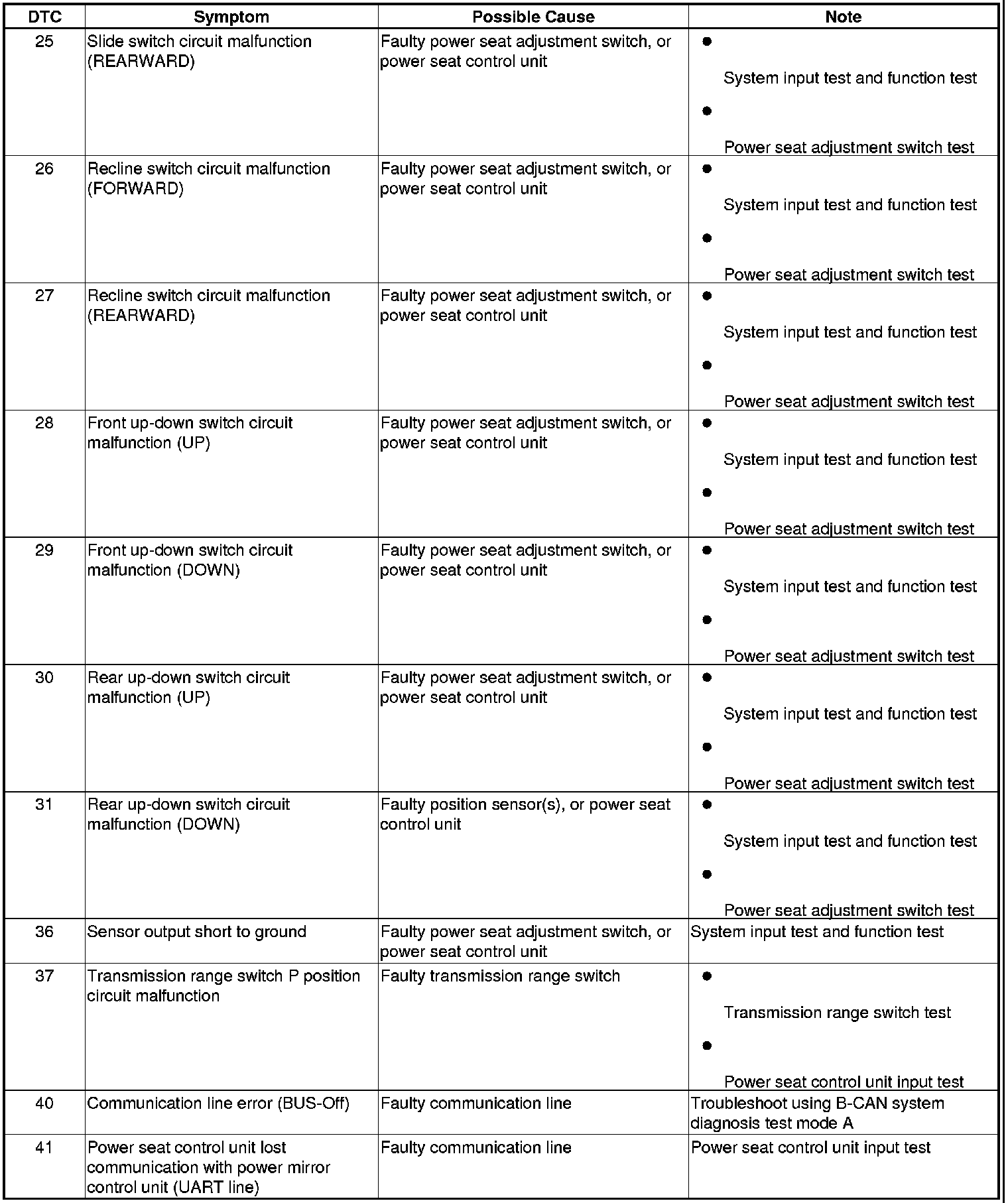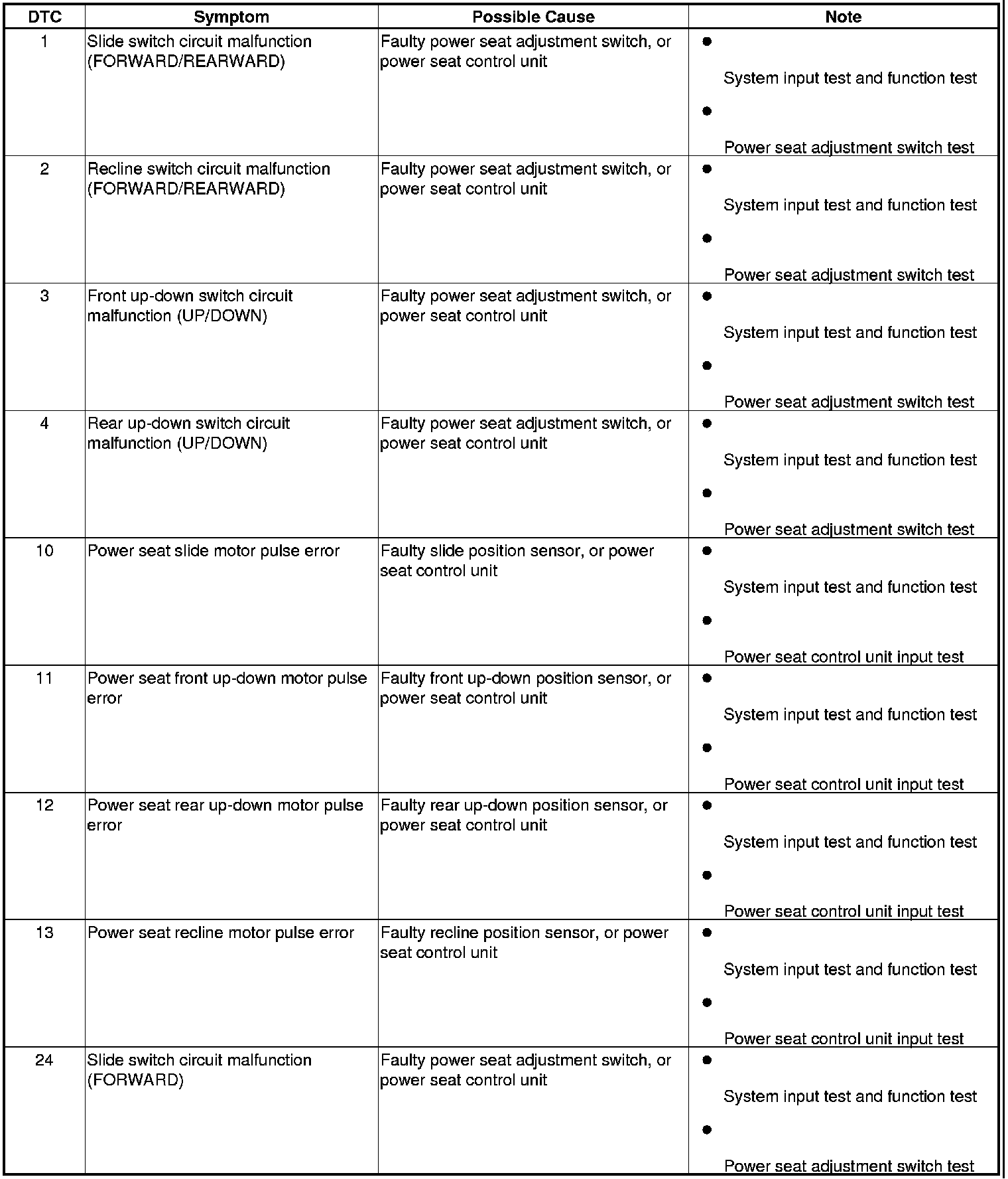 The self-diagnostic function of the driving position memory system detects system problems. If a system problem is detected, the buzzer built into the power seat control unit sounds for 5 seconds. This information can be retrieved through the driving position memory switch indicators.
