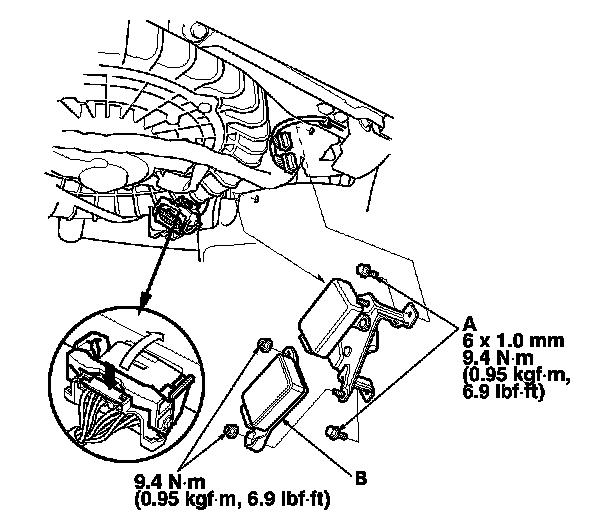3. Remove the bolts (A) from the bracket that holds the HandsFreeLink control unit (B), the throttle actuator control module, and the ACC unit.