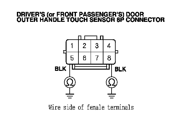 12. Connect driver's (or front passenger's)* door outer handle touch sensor 8P connector terminals No. 2 and No. 6 to body ground with jumper wires.