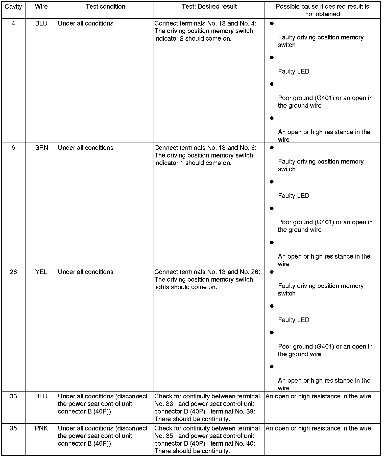 5. Reconnect the connector to the power window master switch, and do these input tests at the following connector.