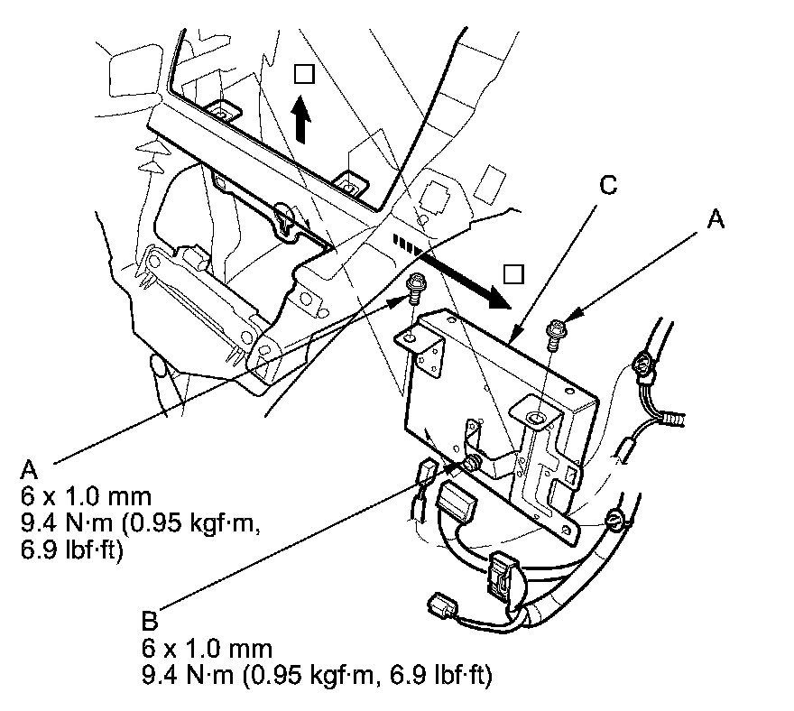 5. Pull the AcuraLink control unit (XM receiver) (C) out, then disconnect the connectors from the AcuraLink control unit (XM receiver), and detach the clips.