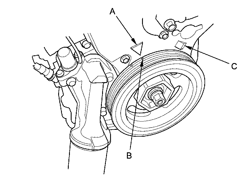 10. Aim the light toward the pointer (A) on the timing belt cover. Check the ignition timing under a no load condition (headlights, blower fan, rear window defogger, and air conditioner are turned off).