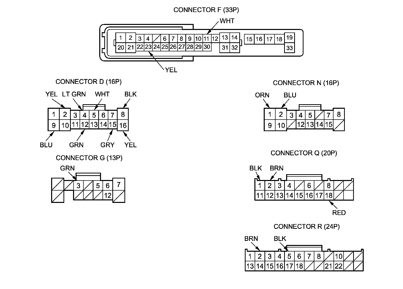 3. Disconnect driver's under-dash fuse/relay box connectors D, F, G, N, Q, and R.