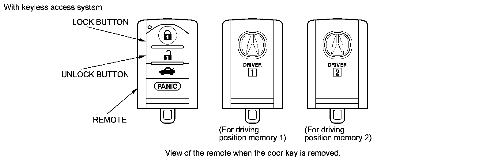 After the seat and mirror positions have been memorized, the seat and mirror will move to the position when the appropriate remote UNLOCK is pressed and the driver's door is opened. When the seat and mirrors move to the memorized position, the green LED corresponding with that remote will stay lit until the position is changed or the key is turned to LOCK (0), or engine start/stop button is pressed to select the OFF mode.