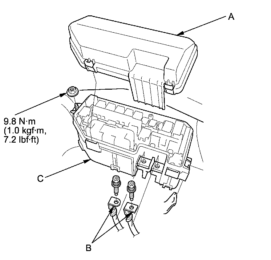 3. Remove the under-hood fuse/relay box (C) from the bracket.