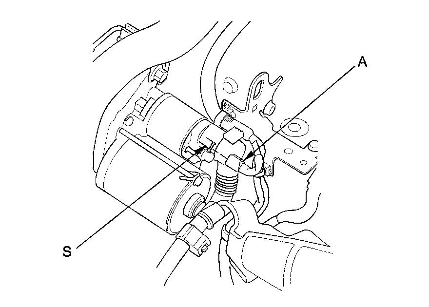 11. Make sure the shift lever is in neutral (M/T model) or N or P (A/T model), then disconnect the connector (A) from the starter S terminal. Connect a jumper wire from the battery positive terminal to the S terminal.