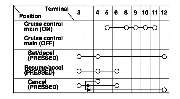 - If there is continuity, and it matches the table, but the cruise control combination switch failure occurred on the cruise control input test, check and repair the wire harness on the switch circuit.
