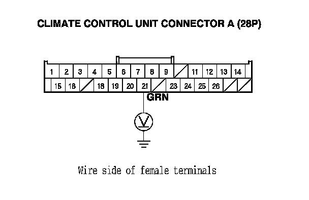 7. Measure the voltage between the climate control unit connector A (28P) terminal No. 21 and body ground.