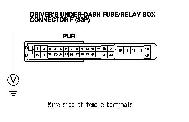 14. Measure the voltage between the under-dash fuse/relay box connector F (33P) terminal No. 5 and body ground.