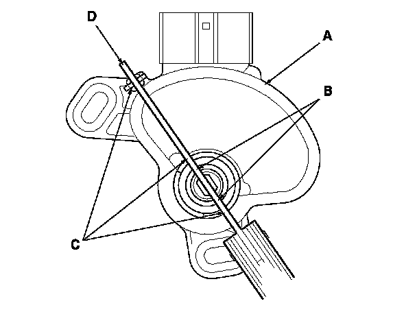 7. Set a new transmission range switch (A) to the N position. Align the cutouts (B) on the rotary-frame with the neutral positioning cutouts (C) on the transmission range switch. Then put a 2.0 mm (0.08 in) feeler gauge blade (D) in the cutouts to hold the transmission range switch in the N position.