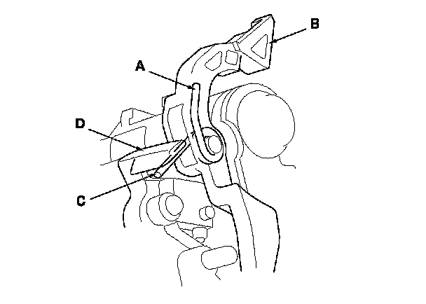 9. Make sure that the release spring end (A) is installed in the shift lock release (B), and the other end (C) of the release spring is on the stop (D).