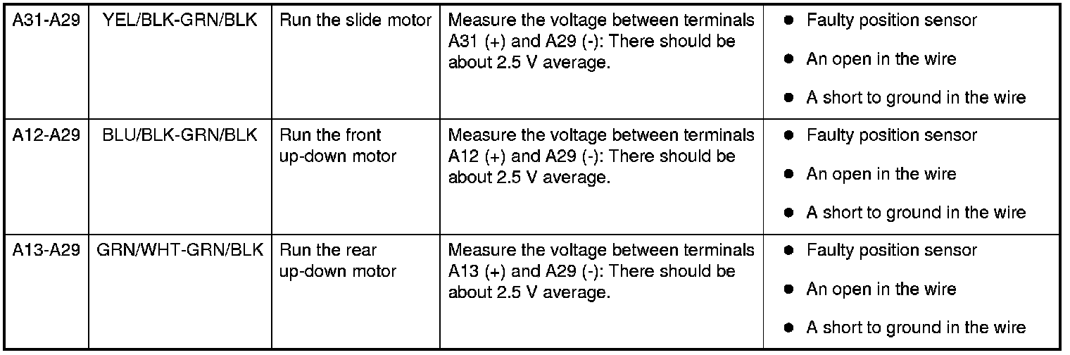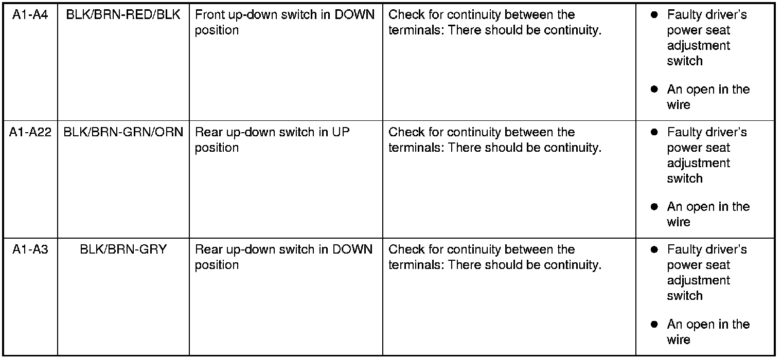 5. Reconnect the connectors to the power seat control unit, and do these input tests at the following connectors.
