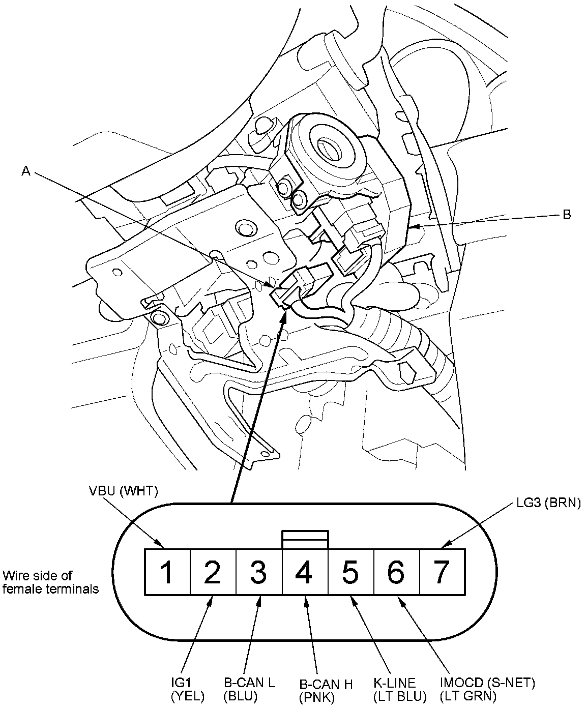 2. Disconnect the 7P connector (A) from the immobilizer-keyless control unit (B).