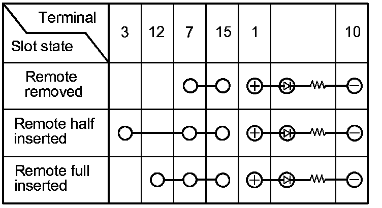 7. Connect the positive battery terminal to remote slot connector terminal No. 16, and the negative battery terminal to terminal No. 8. Check that the remote cannot be removed from the remote slot. Connect the positive battery terminal to remote slot connector terminal No. 8, and the negative battery terminal to terminal No. 16. Check that the remote can be removed from the remote slot.