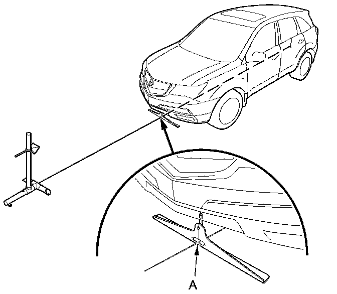 9. With the target and the height rod aligned with the cord, move the target out in front of the vehicle until the cord is fully extended 16.5 ft (5 m) from the front of the front bumper. Position the cord at the centerline (A) of the centering stand.