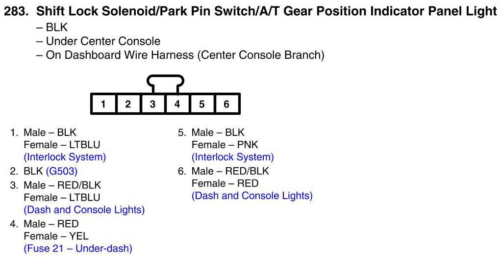 View 283 - Shift Lock Solenoid/Park Pin Switch/A/T Gear Position Indicator Panel Light Connector View