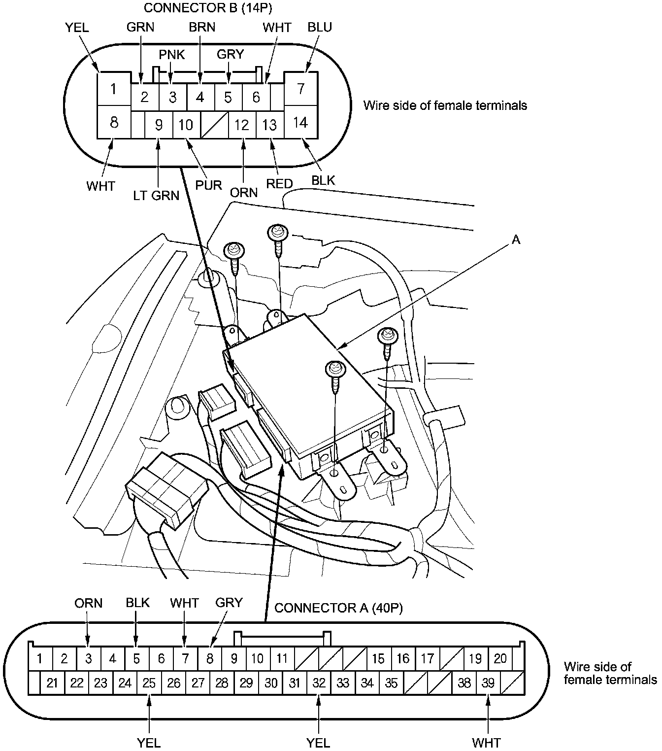 3. Disconnect driver's MPCS unit (A) connectors A (40P) and B (14P).