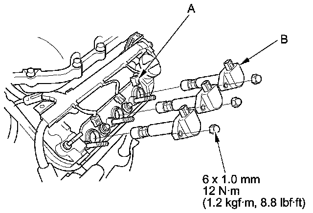 2. Disconnect the ignition coil connectors (A), then remove the ignition coils (B).