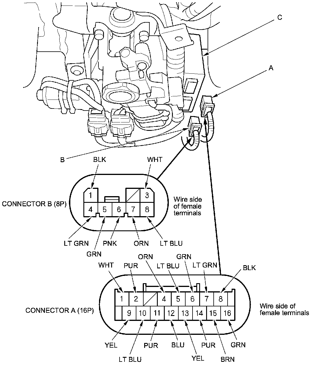 3. Disconnect 16P connector (A) and 8P connector (B) from the power tilt/telescopic steering control unit (C).