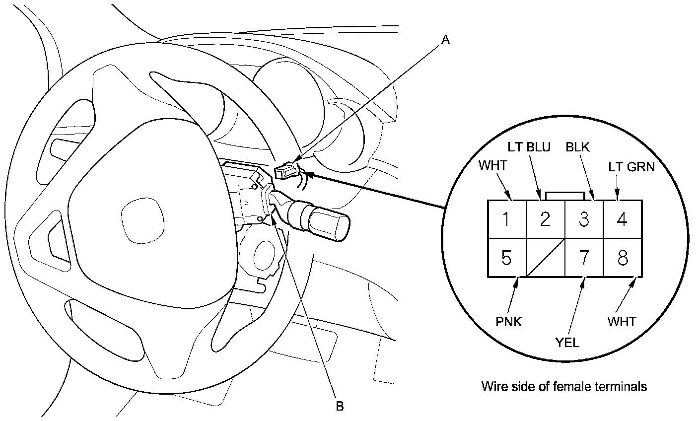3. Disconnect the 8P connector (A) from the wiper/washer switch (B).