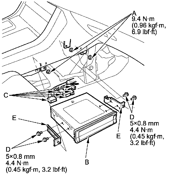 6. Disconnect the connectors (C), then remove the bolts (D) and the brackets (E).