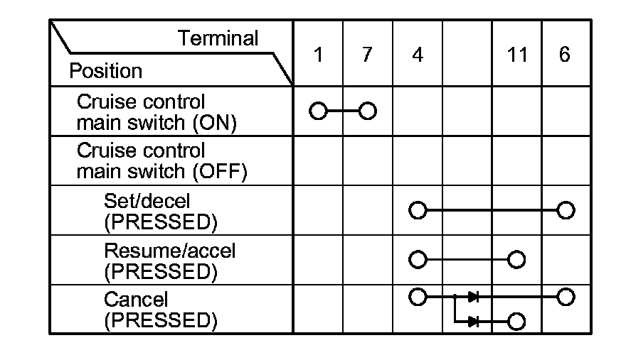4. Check for continuity between the terminals in each cruise control combination switch position according to the table.