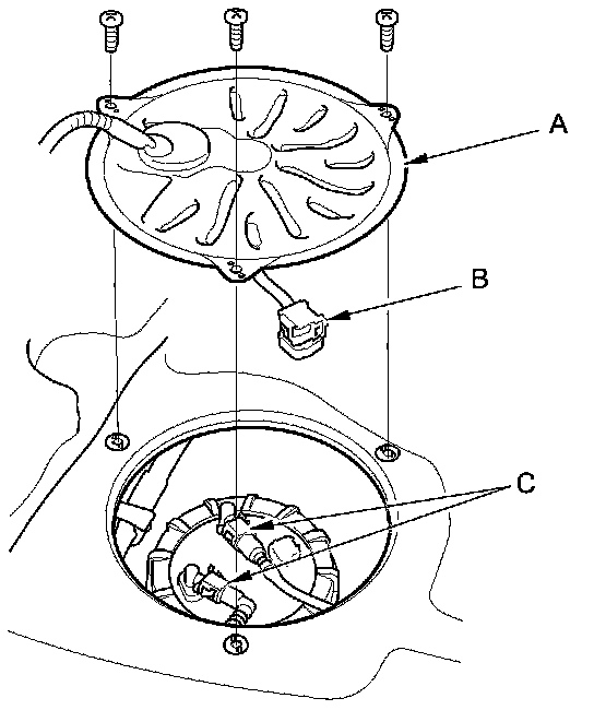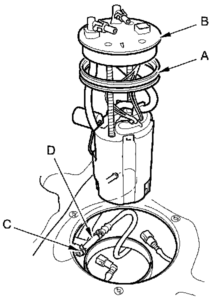 7. Disconnect the quick-connect fittings (C) from the fuel tank unit.