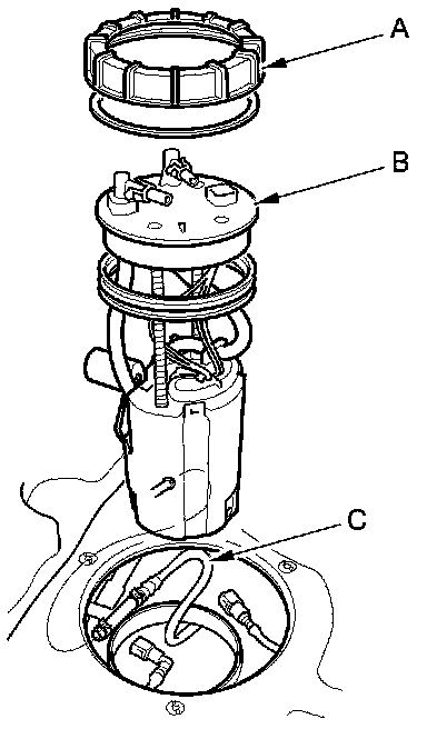 9. Remove the locknut (A), and lift up the fuel tank unit (B) from the fuel tank. Then disconnect the transfer tube (C).